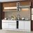 O acabamento da estrutura interna, externa, das frentes das gavetas e das portas dos balcões é branco. As portas dos aéreos são no padrão amadeirado Rustic, em Poliéster Protetor ecológico de alta resistência, que protege o móvel dos efeitos da água, do álcool e do calor.