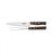 Lâminas de aço inox. A lâmina da faca têm maior durabilidade do fio devido ao tratamento térmico. A lâmina do garfo conta com maior espessura e uma estampagem do aço que garante maior resistência, evitando deformações. Os cabos são de madeira natural. Rebites de alumínio.