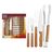 Lâminas de aço inox. As lâminas das facas têm maior durabilidade do fio devido ao tratamento térmico. As lâminas dos garfos contam com maior espessura e uma estampagem do aço que garante maior resistência, evitando deformações. Os cabos são de madeira natural. Rebites de alumínio.